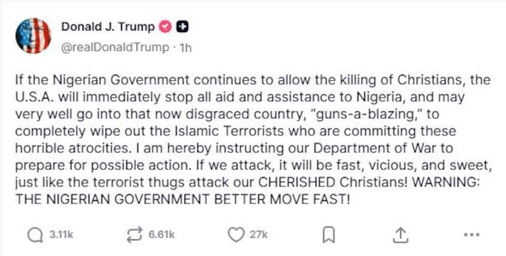 No sábado, o presidente republicano já tinha declarado ter ordenado ao Pentágono a planejar uma possível ação militar em território nigeriano. A justificativa dada por Trump é de que o governo local não está conseguindo conter a perseguição que os cristãos estão sofrendo no país.